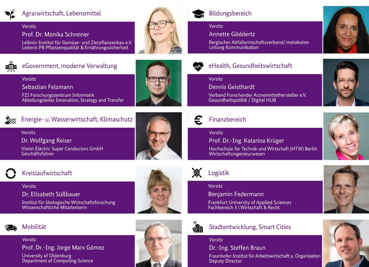 Jede Fachgruppe verfügt über einen Fachgruppenvorsitz, der darüber hinaus punktuell fachliche Diskussionen begleitet, den Austausch mit Interessierten pflegt und anlassbezogen für den Austausch mit dem BMWE oder uns bereitsteht. Die Mitarbeit in einer Fachgruppe ist freiwillig und kann jederzeit beendet werden.