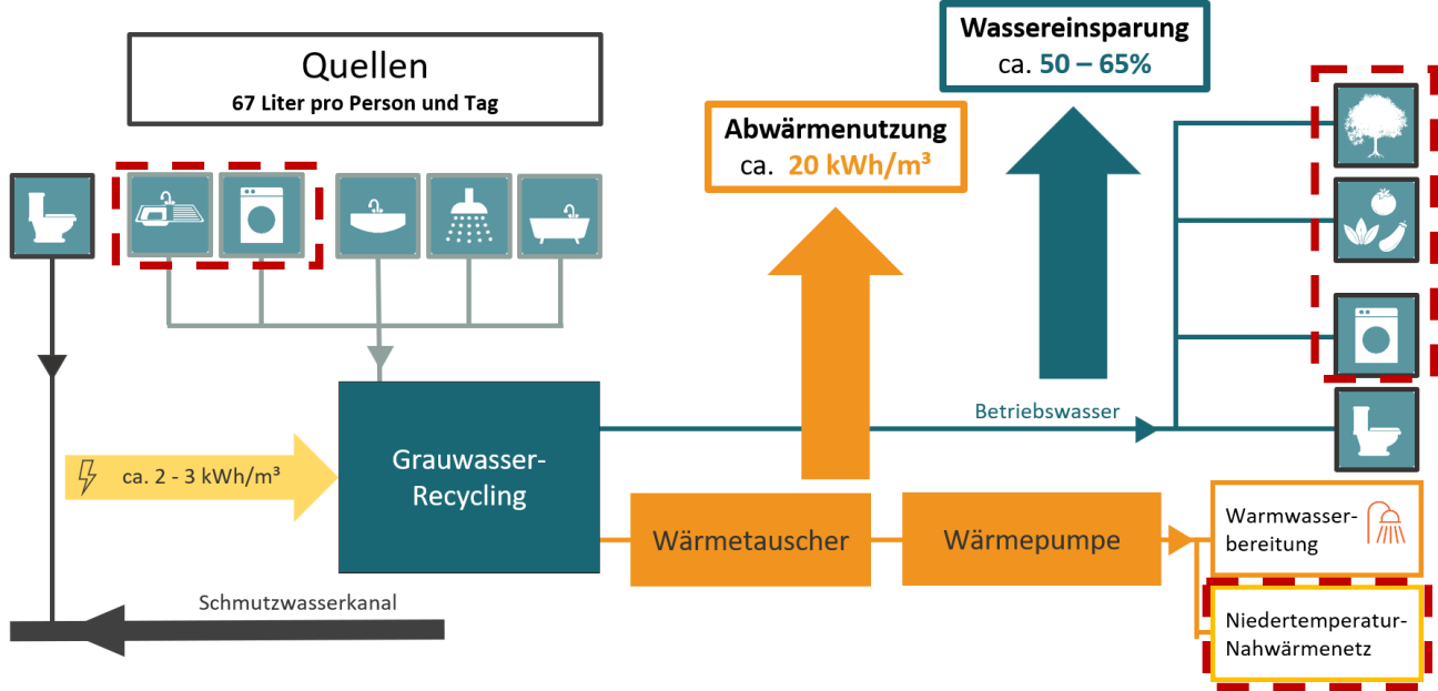 Im Reallabor IWIQ ("Integrierte Wasser- und Wärmerückgewinnung im Quartier") wird erstmals unter realen Bedingungen erprobt, wie Grauwasserrecycling (GWR) und Wärmerückgewinnung (WRG) in Bestandsgebäuden umgesetzt und skaliert werden können. Die technologische Innovation liegt in der Aufbereitung von leicht verschmutztem Grauwasser (aus Bad, Küche und Waschmaschine) zu hochwertigem Betriebswasser, das unter anderem für Toilettenspülung, Waschmaschinen oder Bewässerung genutzt werden kann. Damit lassen sich bis zu 60 % des Trinkwasserverbrauchs einsparen.